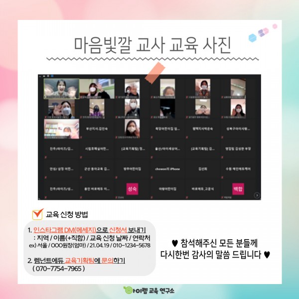 언제 어디서나 기쁨을 찾을 수 있도록 도와주는 마음빛깔 교사교육을 진행하였습니다.