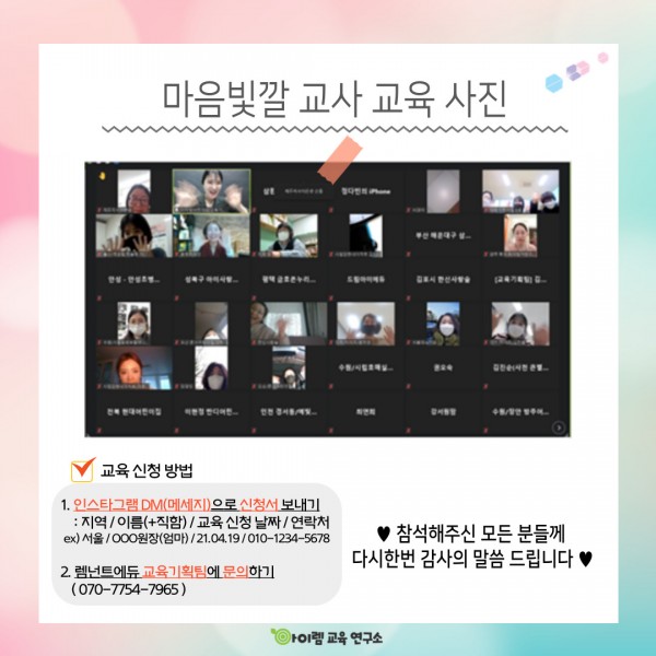 언제 어디서나 기쁨을 찾을 수 있도록 도와주는 마음빛깔 교사교육을 진행하였습니다.