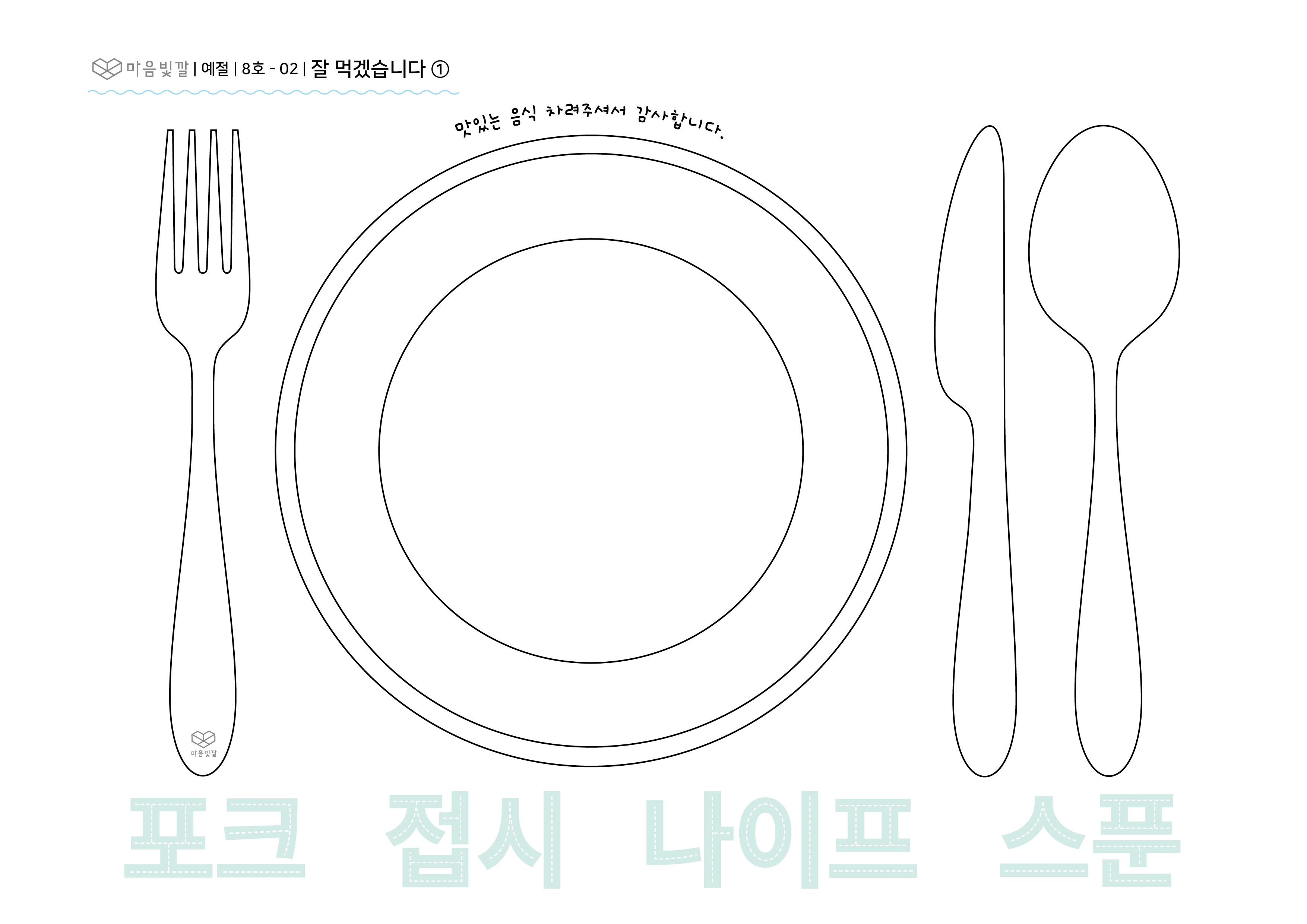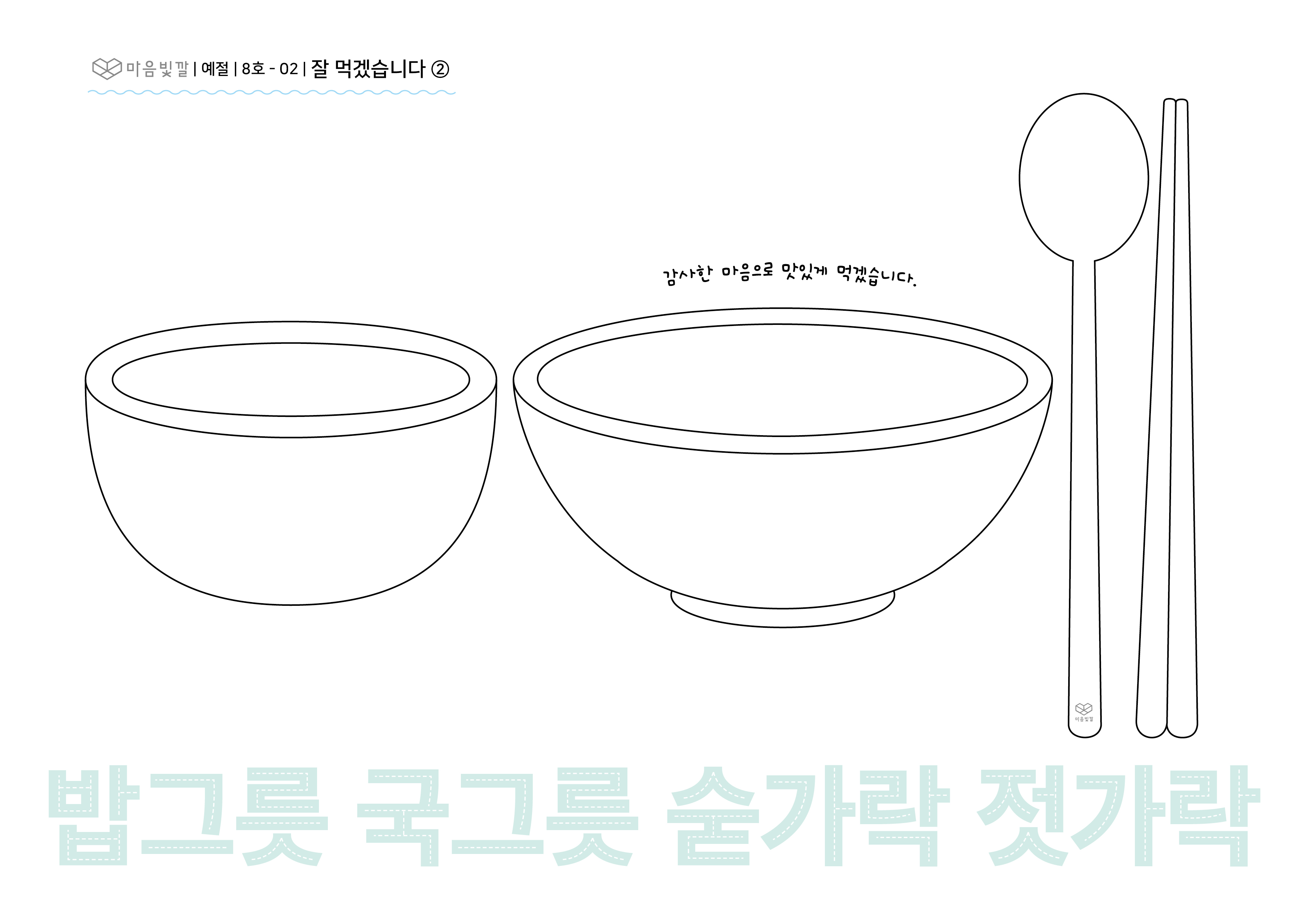 - 식탁에 놓는 숟가락, 젓가락, 그릇 등 글자를 따라 쓰고 색칠해요.