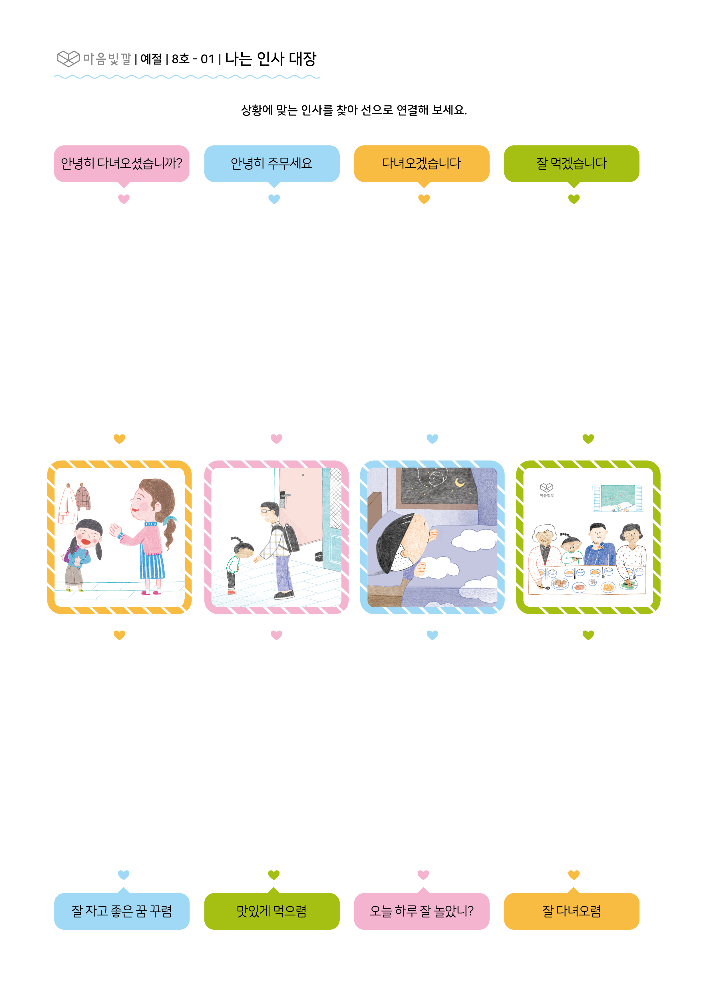 - 상황 그림을 보며 알맞는 인사가 무엇인지 알아보고 선으로 연결해요.