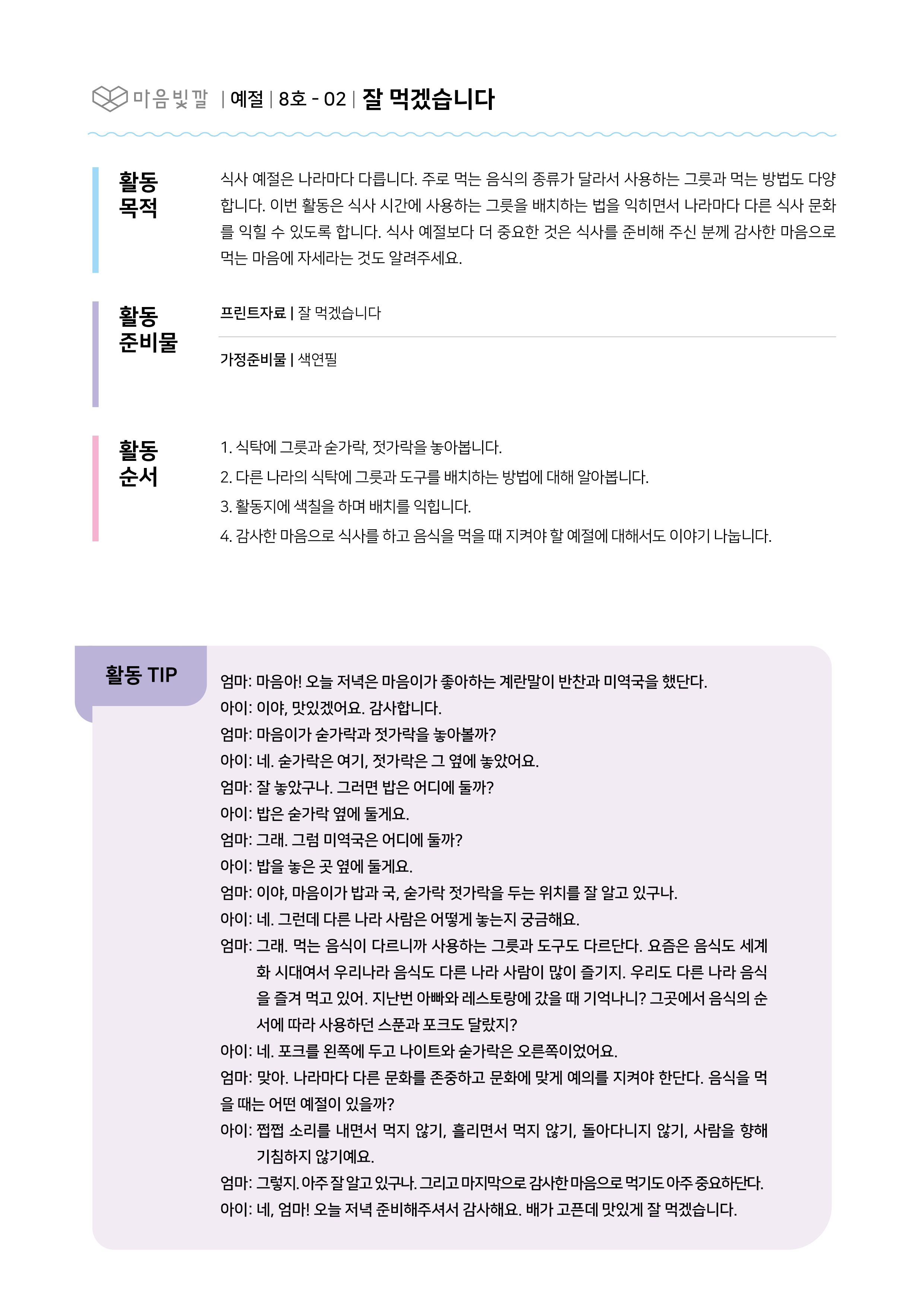 - 식사를 하고 음식을 먹을 때 지켜야 할 예절에 대해 이야기 나눠요.