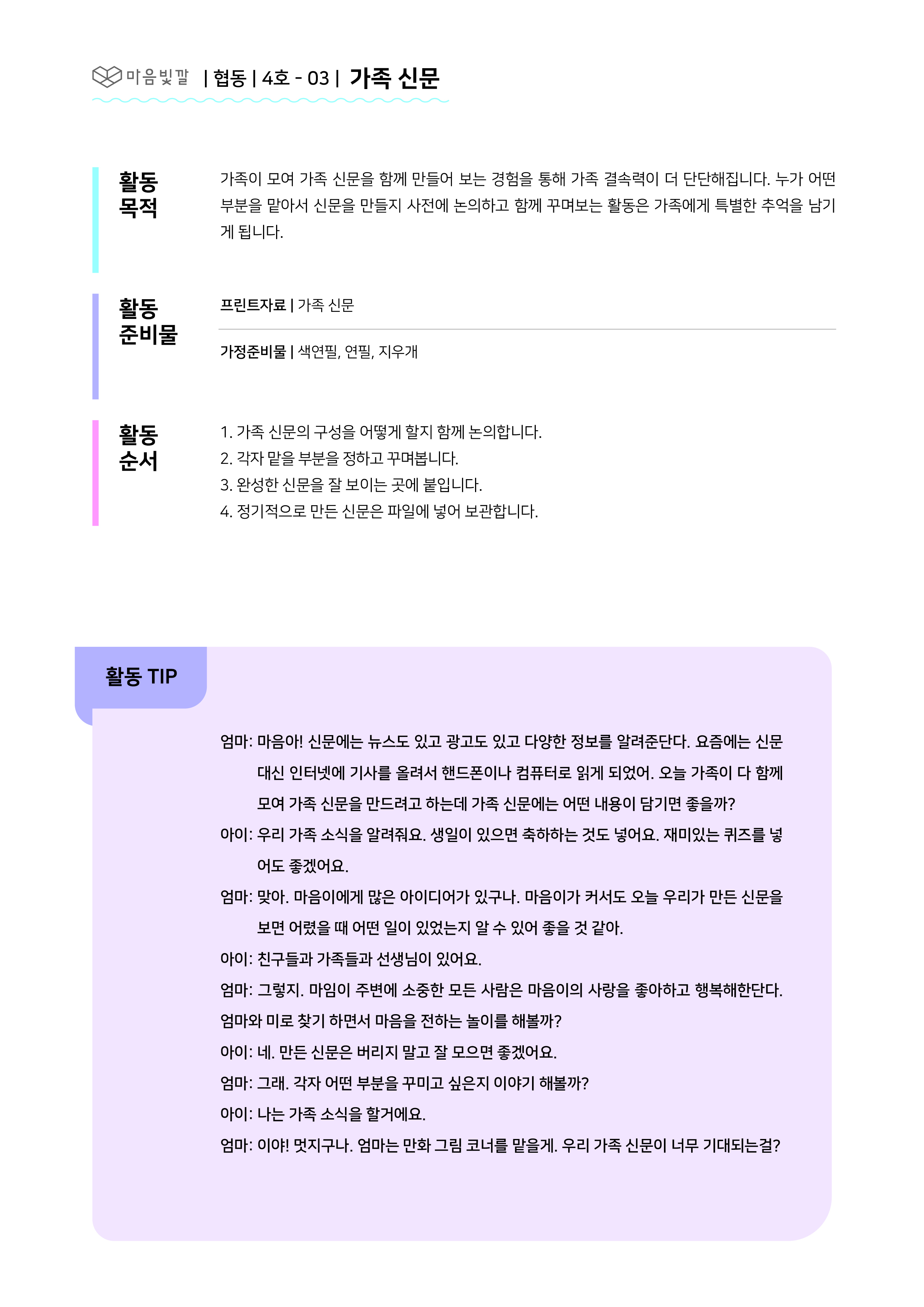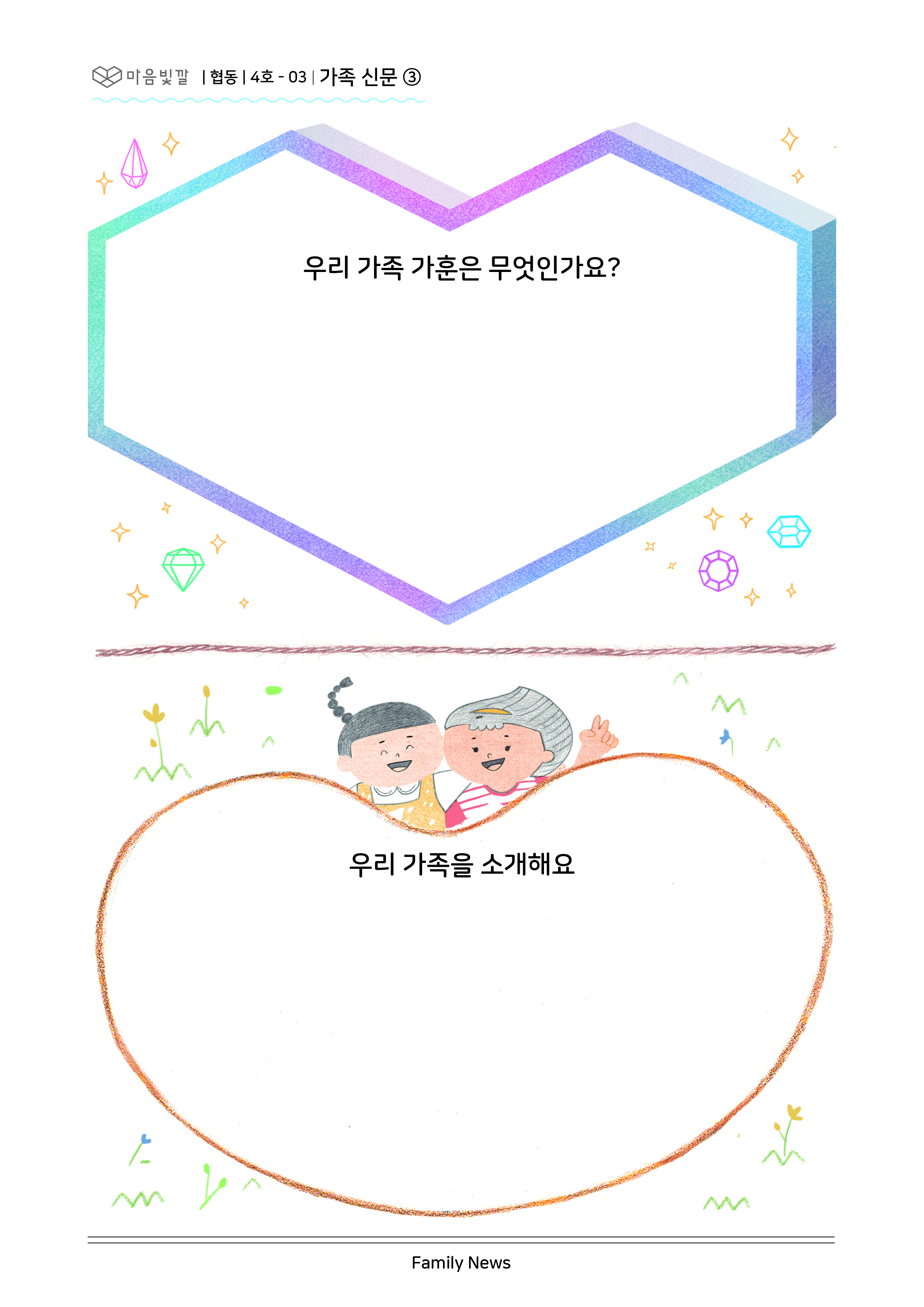 - 가족 신문의 구성을 어떻게 할지 함께 이야기해요.