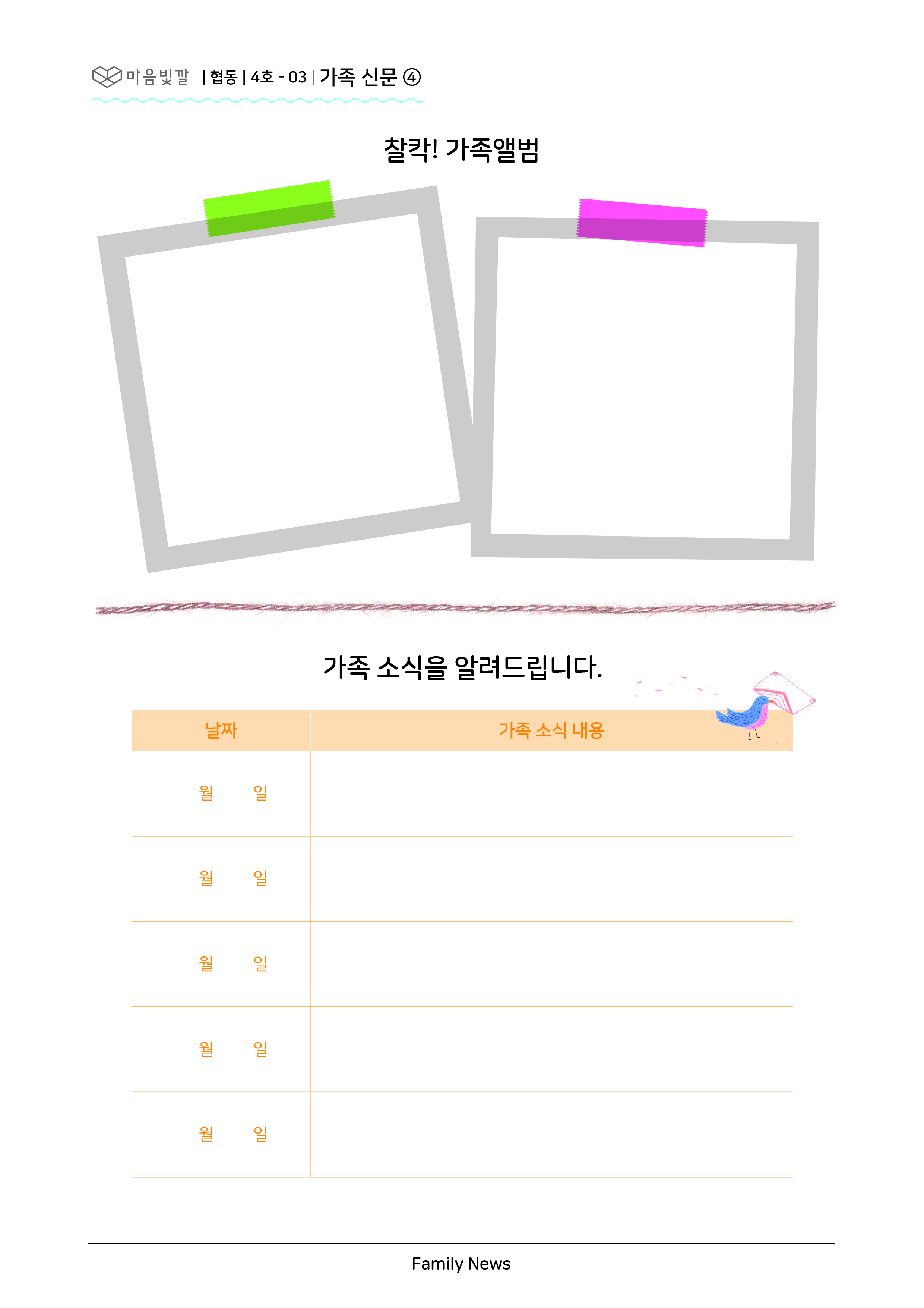 - 각자 맡을 부분을 정해 꾸며보고 완성된 신문을 함께 봐요.